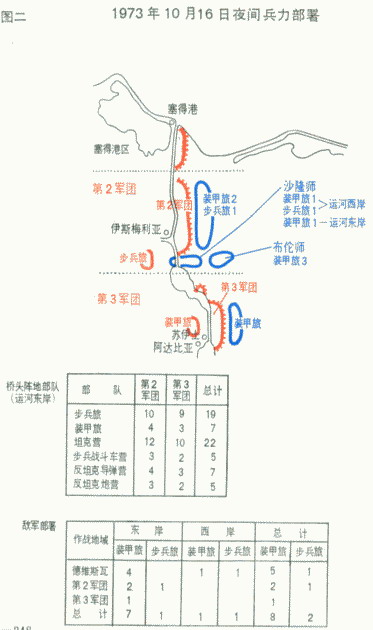 我羞于透露我军十月十七日的部署情况。我们总共拥有二十个步兵旅和轻装甲旅,编成五个步兵师和两个装甲师。每个步兵师拥有下列建制部队。四个坦克营,一个步兵战斗车营、一个反坦克导弹营、一个反坦克炮营、九个炮兵营(共一百二十四辆坦克、三十六枚“马洛特卡”式反坦克导弹、四十辆BMP步兵战斗车、三十六门85毫米反坦克炮,九十门82毫米和107毫米无坐力炮、五百三十五具RPG火箭筒、一百零八门亦可用作反坦克武器的野战炮)。一个步兵师如果能用这些武器构成良好的防御配系,就能击退敌人三个装甲旅的进攻;尽管如此,我们还额外给每个步兵师加强了三十六枚反坦克导弹、二十一门SU-100自行反坦克炮和一个完整的装甲旅。给每个师补充的装甲旅和反坦克导弹只是为了在渡河时增加步兵的反坦克能力。我们的计划始终是让这些增援部队在完成增援任务后归还原建制。我现在就正把反坦克导弹撤回。但是,由于已有了不准从西奈撤回一兵一卒或任何一件武器的政治决定,因此那些坦克只能留在原地。我们在前线的八个装甲旅的战斗损耗很大。十月十七日晨,它们的部署情况如下: