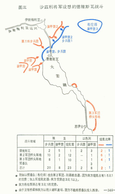 这时,第一线防御配系将由巴列夫要塞中的步兵旅和三个坦克营的一百二十辆坦克组成。第二线将由三个坦克旅的其余二百四十辆坦克组成。任何新的增援部队均须越过西奈半岛从后方调往前线。