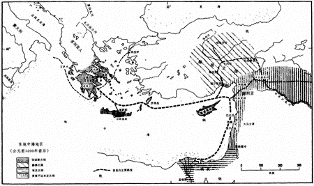 公元前1400-前1200年,阿卡亚人的海上迁徙 在连续不断的移民潮的影响下,阿卡亚人和其他的地中海民族也加入了“海上民族”的行列,这一行动对中东的地中海沿岸产生了极大的影响(参见①第一章→地中海-中东→埃及→“海上民族”入侵;②第一章→地中海-中东→美索不达米亚→赫梯王国)。
