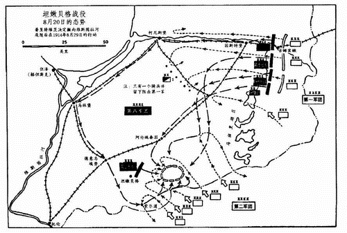 1914年8月22日,鲁登道夫的计划 在研究了来自东线的报告之后,鲁登道夫向各个军指挥官发出电报命令,要求他们朝着萨姆索诺夫的第二军团实施集中,同时迟滞伦宁坎普夫的第一军团进一步向东的运动。那天晚些时候,他与兴登堡一起乘火车去东线,并在路上报告了他的计划,兴登堡表示赞同。当他们于次日抵达马林堡 [ 译者注:今马尔堡。 ] 第八军团的司令部,发现普里特维茨的参谋部作战处长——精明强干的M.霍夫曼中校,已在8月20日,准备了与鲁登道夫命令非常一致的机动和部署(德军在处理意外情况方面,通过总参谋部的工作过程表现出很强的一致性,这一巧合无疑是一个有意义的证据)。一个单独的骑兵师用于迟滞笨手笨脚摸索前进的伦宁坎普夫,与此同时,德军主力则通过铁路和公路向南转移,去对付同样笨拙的萨姆索诺夫。