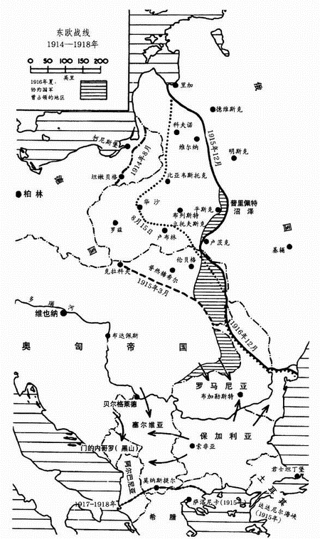 1914年8月23日-9月2日,奥军的进攻 奥军在总参谋长康拉德将军的协调组织下从加利西亚侵入俄国的波兰。其第一、第四和第三军团(从左至右)从伦贝格(利沃夫)出发,在322公里的正面上向北和东挺进。在普里佩特沼泽 [ 译者注:即波列西耶沼泽。 ] 的西南,与N.伊万诺夫将军率领的俄军西南集团军(包括第四、第五、第三和第八军团)相遇。8月23-24日,在克拉斯尼克之战中,俄军北翼的第四军团被奥军第一军团打退。8月26日-9月1日,在扎莫什奇-科马罗夫之战中,奥军第四军团攻打并击退了俄军第五军团,到此时交战升级了。但在8月26-30日的格尼拉亚利帕之战中,奥军南翼的第三军团(包括迟迟才从塞尔维亚战线上赶来的第二军团的一部)被俄军第三和第八军团打退至伦贝格。随后奥军实施防御。9月3-11日,在拉瓦-罗斯卡,当俄军第五军团从奥军第一和第四军团之间达成突破时,奥军再次被打败并大伤元气。奥军放弃伦贝格,退却160公里至喀尔巴阡山脉,仅保留了一个关键性要塞普热米什尔。俄军占领整个加西利亚,随即准备向喀尔巴阡山脉实施进一步推进。该役,奥军伤亡达25万人以上,另有10万人被俘。俄军的损失无记录,不过一定也相当大。