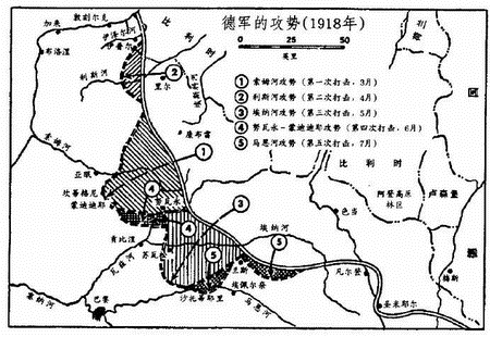 1918年6月9-13日,努瓦永和蒙迪迪耶(第四次)攻势 通过德军逃兵提供的情况,福煦和贝当已做好准备。法军的防御成纵深梯次配置。法军的炮火反准备破坏了德军第十八军团的进攻。德军在取得一些进展之后,终于在6月11日被法美军实施的反击所阻止。第七军团的进攻亦很快在6月12日被阻止。到这时已有25个美军师抵达法国,其中7个师已投入战斗。法国和英国的领导人都竭力想把美国部队长久地编入他们各自的军队之中,而潘兴对此进行了抵制。