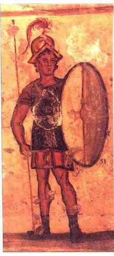 亚历山大的后继者们派出的军队在组织和装备上越来越遵循罗马军队的模式。这幅来自小亚细亚西部的公元前2世纪的墓画,描绘的是一个在埃及托勒密二世军中服役的安纳托利亚雇佣军。他戴着青铜头盔,身穿鳞状甲胄,手持埃及国王托勒密军队中使用的盾(thureos)。所有这些,反映出地中海地区试图在一切可能的方面赶超优势的罗马武器和军事组织的倾向。