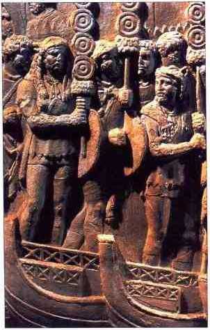 来自图拉真凯旋柱中的一幕:部队搭乘着一艘战船。公元前3世纪60年代以前,罗马几乎没有什么航海作战的经验,而当它开始建设海军的时候,它并不是要掌握希腊传统中复杂的调兵技术和船只作战技术,它的战船只是海运步兵的一块跳板。它模仿了古希腊手划战船的传统并进行了一定的革新。这种小型的快速战船(“大乌鸦”)其实是一架带钩的起重机,有24只足,通过一个滑轮,它能被提起,旋转或降下。如此,罗马步兵可以轻松穿过敌船的阻碍。后来,船上有了一些加固的防御设施和一个鱼叉形的虎爪钩,这虎爪钩从船上一个投石器发射出来,可抓住敌船并死死将其缠住。罗马海军成功的关键,是修造了大量的战船并成功地组织起熟练而能干的船员。