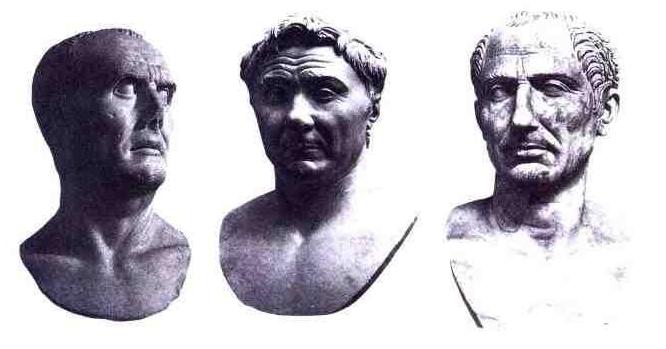 苏拉(左)(死于公元前79年),庞培(中),(死于公元前48年)和恺撒(右)(死于公元前44年)都极具讽刺性地蔑视共和政府,并对调遣全心效忠于自己的军团的能力有一种绝对的自信。由于他们三人都对军团的装备和战略战术上的改进做出了突出贡献,而且事实证明他们是战争利益的天才管理者,因此他们成为后世地方海盗效法的偶像。这些海盗同样地收买雇佣军团,藐视帝国指令,迫使罗马接受他们所要求的权益。无数罗马人直接或间接因这三位大将的军团而死,其数量之大甚至超过罗马全部海外战争中所死去的人。