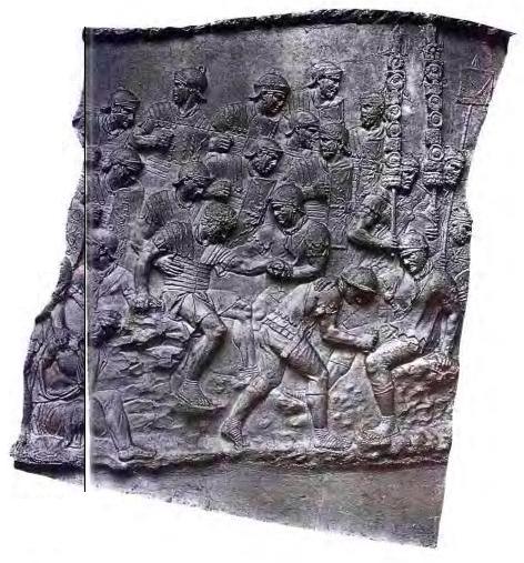 前线医疗站中一个虚弱的军团伤员。在他后面,别的士兵正在排队等候重回战场的机会轮到他们。这是来自罗马图拉真凯旋柱中的一幕。罗马人不像别的民族,他们认为表现自己的战斗伤亡并不是什么羞耻的事情。这里看到的这些接受治疗的伤兵的画面,并不意味着罗马人承认自己的虚弱,它其实是在确认自己先进的军事组织和对战场上士兵的周到关怀。