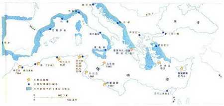 船员和桨手的主要征募地区——16世纪的地中海已经成为基督徒(北面、西面)和穆斯林(南面、东面)的海上战场。孤立的外围据点纷纷陷落,西班牙占领了佩尼翁·德·贝莱斯,土耳其占领了罗得岛和塞浦路斯。地中海上的一些战略要地更是争战频繁。例如,仅突尼斯一地,就曾易手四次:1535年和1573年先被基督徒占领,热后又在1570年和1574年被土耳其重新夺回。但这时和平出现了,先是威尼斯,然后是西班牙,分别于1573年和1577年与土耳其签定了休战协议,巨大的单甲板平底船让位给了小巧的海盗船队。