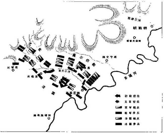 一到达多瑙河,他就与萨伏依的尤金亲王率领的一支奥军会师,8月13日,两军共同面对驻扎在布莱尼姆的敌军。法国-巴伐利亚联军有5.6万人,而莫尔伯勒和尤金指挥着5.2万人。莫宁伯勒军在左,划分为方形,对抗由塔拉尔指挥的一支法国军队;尤金军在右,面对着一支由马尔桑和巴伐利亚选侯指挥的法-巴联军。
