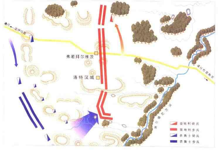 在洛特伦战役中,普鲁士的腓特烈打破了一条已知的战争规则,在穿过奥军前沿时,集中军队进行侧翼攻击,从而赢得了最大的胜利。他很有技巧地将自己的行动隐藏在一座树木繁茂的山梁后,用一个假动作把奥地利人的注意力吸引到右翼上,而他却向对手的左翼发起突然的攻击。