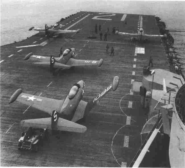 舰载机联队中这种战斗机和攻击机数量4:1的比例,是第二次世界大战后期航母舰载方式的延续,在那一时期航母搭载的用于执行攻击任务的战斗型飞机的数量越来越多。经过改进的F4U-4B型号“海盗”战斗机像它的鸥翼式的“前辈”一样也是非常出色的攻击机,它取代了原有航母舰载的并不受欢迎的SB2C型“俯冲者”(Helldiver)轰炸机(许多“俯冲者”轰炸机早期的缺点在SB2C-3和之后的型号中都被克服了。1949年最后一批SB2C中队从海军一线部队退役)。F4U-4B型“海盗”战斗机的最高时速可以达到446英里/小时(718.06千米/小时)。它装备有4门20毫米口径的翼挂式机炮,并能携带8枚5英寸(127毫米)的火箭和2枚1000磅(453.60千克)重的炸弹。
