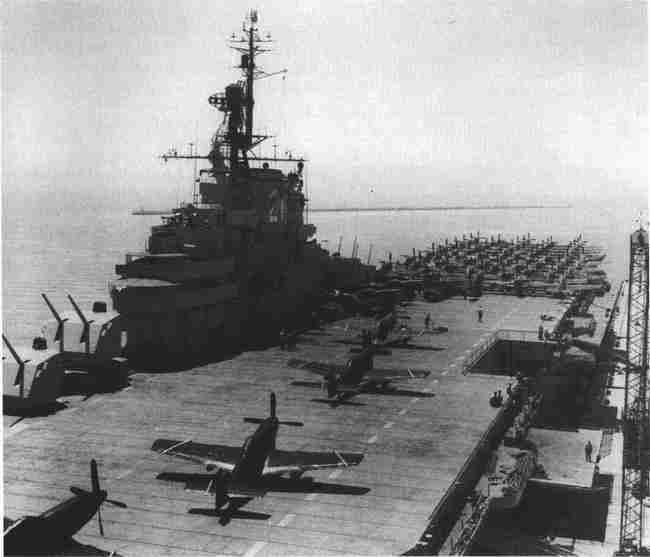 F-51型“野马”战斗机被装载在“拳师”号航母上高速运往战区。战争爆发时,“拳师”号刚从西太平洋地区返回。由于不能马上与航空战斗群配合作战,“拳师”号被暂时征用为运输舰,负责把远东战场所需要的随时可以投入战斗的活塞引擎战斗机运送出来,因为喷气式飞机的续航能力有限。(《美国海军》)
