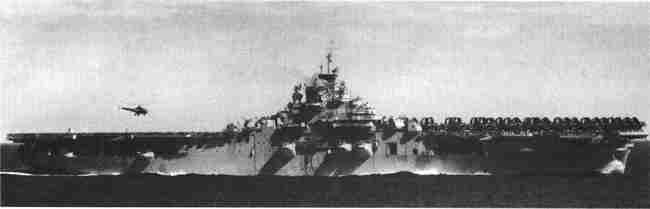美国护航航母在朝鲜战争中表现英勇。图片是1951年2月“西西里”号航母完成沿朝鲜海岸的任务返回驶入圣迭戈时进行展示的情景。它的全体舰员在飞行甲板上排列出航母的名字,这是一个海军将领们喜欢而士兵们厌恶的惯例。2架L-5型“哨兵”飞机和1架HO3S-1型直升机停放在11架F4U型“海盗”战斗机和AD型“空中袭击者”战斗机的前面。(《美国海军》)