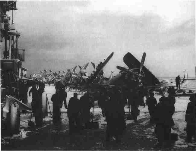 朝鲜战争期间,美国航母经常在夜间并且是很坏的天气情况下执行任务。1952年1月的这场暴风雪使“埃塞克斯”号航母的飞行任务全部停止了。在这些正在飞行甲板上铲雪的士兵后面停放着AD-4NL型“空中袭击者”战斗机、F4U-5NL型“海盗”战斗机、F2H-2型“女妖”战斗机和F9F-2型“黑豹”战斗机。词尾有字母“L”表明是“防冻型”的飞机。(《美国海军》)