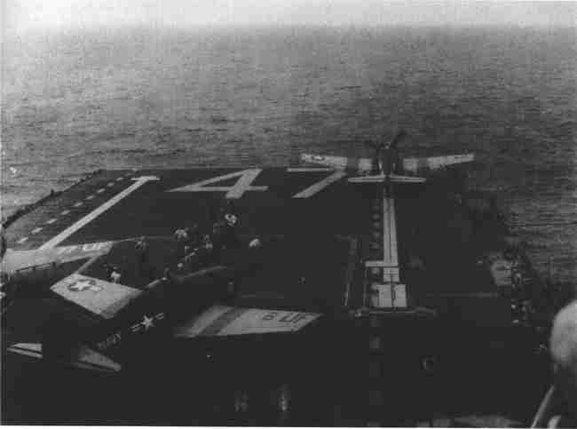 美国海军舰载战斗机由于击落了11架敌机而受到赞誉:海军F9F型“黑豹”战斗机击落了2架“雅克”-9活塞式螺旋桨战斗机和5架米格-15涡轮喷气战斗机;“巴丹”号航母的海军飞行员驾驶F4U型“海盗”战斗机击落了3架“雅克”战斗机;“西西里”号的海军上尉耶西·G.福尔曼(Jesse G.Folmar)驾驶1架F4U-4B型“海盗”战斗机击落了1架米格-15战斗机。1952年9月10日,福尔曼和他的僚机飞行员在北朝鲜镇南浦附近执行攻击任务的时候遭遇了8架敌方喷气式战斗机。福尔曼击落了其中1架米格战机,但是他驾驶的“海盗”战斗机在遭遇战中受损,福尔曼跳伞逃生落进海里,等待海军两栖飞机的救援。