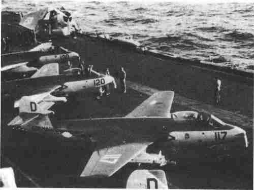 “卡尔·杜尔曼”号航母承载荷兰皇家海军驾驶的唯一的涡轮喷气式战斗机“海鹰”FGA.6。在这张1959年的照片中,“海鹰”配备了“响尾蛇”空对空导弹。飞机上印有Koninklijke海军字样。(荷兰皇家海军)