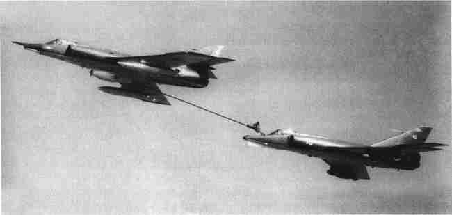 除了美国,唯一的超音速舰载战斗机将在法国和苏联研发。法国“军旗Ⅳ”(右)是单引擎飞机,在3.6万英尺(10973米)高空的飞行速度为1083千米/小时(1.02马赫),最高可攀升至5.085万英尺(15499米),最初每分钟可攀升2万英尺(6096米)。在这张图片中,“军旗Ⅳ-P”侦察机/加油机在给一架Ⅳ-M补给燃料。