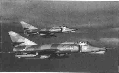 两架“军旗”Ⅳ-P侦察/油罐机按阵列飞行。这些飞机携带5架照相机,它们并未武装。最瞩目的要属其固定受油探管,Ⅳ-M探管。Ⅳ-P在1960年11月19日首飞。从1982年开始这些飞机在前南斯拉夫领土及波斯湾的黎巴嫩执行作战任务。(法国海军/E.C.Armées)