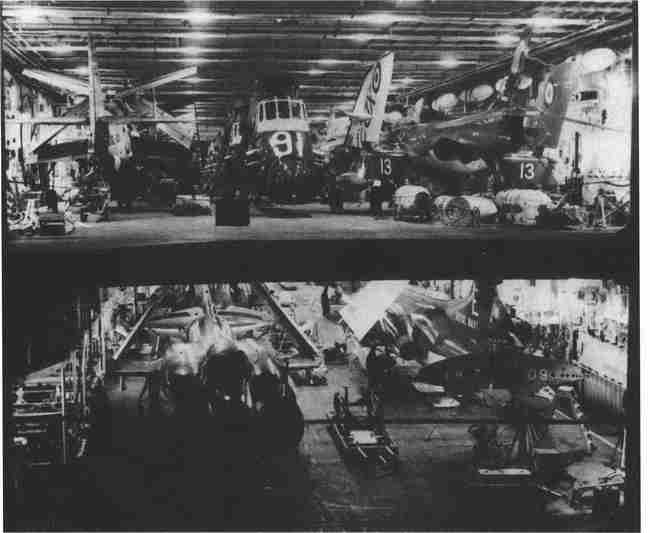 因为第二次世界大战战后时期可利用的航母的数量有限,英国航母舰队承载的飞机不得不同时具备攻击和反潜能力。这是皇家“鹰”号的飞机库,图上方从左至右依次为“塘鹅”空中预警机、“威塞克斯”(Wessex)直升机、“弯刀”(Scimitar)战斗机,图下方为“掠夺者”(Buccaneer)飞机。“掠夺者”“09”尾部的俯冲制动器被延长了。(皇家海军)