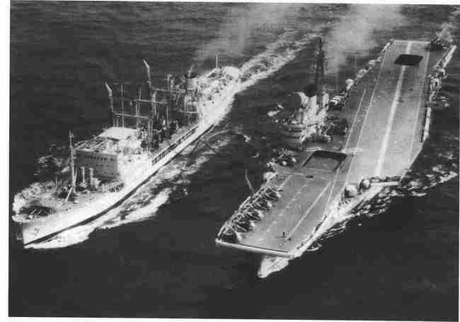 加拿大航空母舰“波拿文都”号正由补给船“供应者”号(Provider)补给燃油;一艘驱逐舰同时也在“供应者”号右舷补给燃料,还有两艘也在等待。这一时期,加拿大海军中的大部分轻型航母都是英国建造,而其上承载的飞机为美国和英国的固定翼飞机和美国的直升机。(加拿大皇家海军)