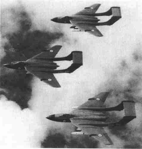 海军航空兵部队飞机的新时代由这些航母开始拉开。第一批就是取代了“海毒”的“海雌狐”全天候战斗机。两种飞机都具有与德·哈维兰喷气式飞机相同的双机身结构,这也是它们的相似之处。“海雌狐”要比它之前的大得多(大约3.5万磅(15887千克),“海毒”约为1.58万磅(7172千克)),新型飞机不再只有1个喷气发动机而变成了2个,新型的战斗机性能更加卓越。作为用导弹取代了枪炮的第一批海军航空战斗机,“海雌狐”有2个可伸缩火箭发射器,每一个都能携带14枚无制导口径2英寸(50毫米)火箭和4枚“火光”红外线自控导弹。在进攻方面,“海雌狐”能够携带2枚重1000磅(454千克)的炸弹和4枚500磅(227千克)炸弹或两枚“小斗牛”空对地导弹。“海雌狐”的驾驶员坐在机身左侧的驾驶室,领航员坐在驾驶员的旁边但是位置要稍低一些。飞机先进的雷达直接与984 3-D雷达相连来加强对入侵飞机的拦截能力。“海雌狐”于1951年9月26日首飞,但是飞行中队的交付直到1959年7月第892飞行中队接收飞机才开始。FAW.2变种飞机在1963年开始归入航空队。这些变体飞机主要的不同之处在于配备了改进的“红头”红外线空对空导弹和拆除了可伸缩机身火箭发射器。一共生产了114架“海雌狐”战斗机。