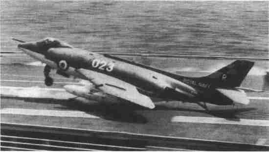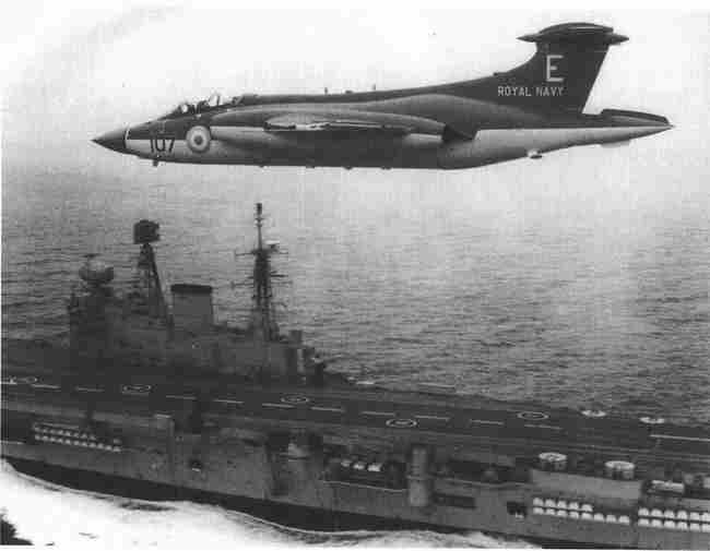 英国第二次世界大战以后生产的最先进的航母飞机是霍克·西德利公司生产的“掠夺者”攻击机。S.2“掠夺者”在3万英尺(9144米)高空的飞行速度为998千米/小时(0.92马赫),在200英尺(61米)高的速度为1038千米/小时(0.85马赫);每分钟可向上攀升1.5万英尺(4572米)。飞机的炸弹舱门旋转投弹4枚1000磅(454千克)炸弹,飞机上还装有6架侦察相机。4个“派龙”(引擎和机翼间的悬挂结构)上可携带重达1.2万磅(5447千克)的炸弹或4枚“小斗牛”空对地导弹。图片上显示的是“掠夺者”S.1从“鹰”号航母上起飞,并携带了2枚“小斗牛”导弹和2个马特拉火箭发射器。注意飞机尾部俯冲制动器开放和闭合的状态。(皇家海军;霍克·西德利航空公司)