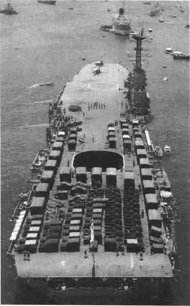 第一艘采用攻击直升机的英国航母是“壁垒”号,这里显示的是它在新加坡。航母后方停泊着海军陆战队车辆和炮兵部队,前端还有两架“旋风”直升机。这些交通工具一般停泊在飞机库甲板上。小一些的交通工具可悬挂在直升机下运上岸;较大的可由吊艇架上的4艘登陆艇运输。(皇家海军)