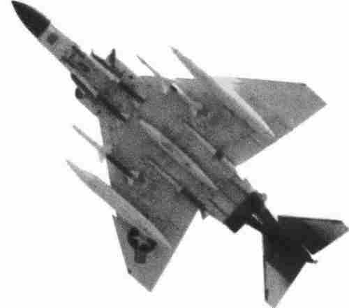 一架改进了的携带6枚“麻雀”Ⅲ空对空导弹和3个副油箱的F-4J“鬼怪”战斗机平面图。F-4J是最新型的“鬼怪”。美国海军、海军陆战队和空军都使用“鬼怪”;皇家海军在航母上使用F-4K型变体“鬼怪”,还有11个国家使用陆基“鬼怪”。美国海军和海军陆战队的F-4并没有内置枪炮武器。(《美国海军》)