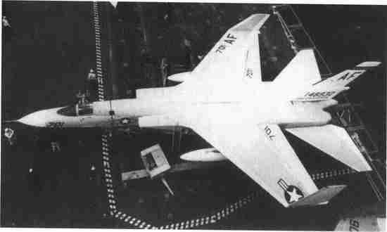 F-4“鬼怪”Ⅲ战胜了F8U-3“十字军战士”Ⅲ成为美国海军全天候武装导弹的战斗机。这里显示的F8U-3携带了2枚“麻雀”Ⅲ导弹,F8U-3并没有内置枪炮。飞机尾部还有巨大的尾翅,在低速飞行时可以旋转使飞机与地平线保持水平,在高速(超过2马赫)飞行时可以转到垂直状态保持飞机的平稳。注意它的吸气构造。(《美国海军》)