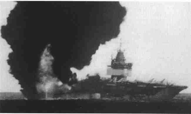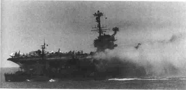 上尉指挥官约翰·S.麦凯恩(John S.McCain)将一枚1000磅(454千克)的炸弹从A-4中扔到了甲板上。火焰引爆了炸弹。麦凯恩从驾驶室中爬出,在掉到飞行甲板前爬到飞机的固定加油探头前,此时火焰已经包围了他的飞机。当火焰蔓延过来时,其他飞行员逃离了飞机,共有7枚炸弹在飞行甲板上引爆。甲板下的飞机燃料一起火,飞行甲板下面的船员舱即刻成为50名船员的死亡陷阱。其他船员被炸到了船下。