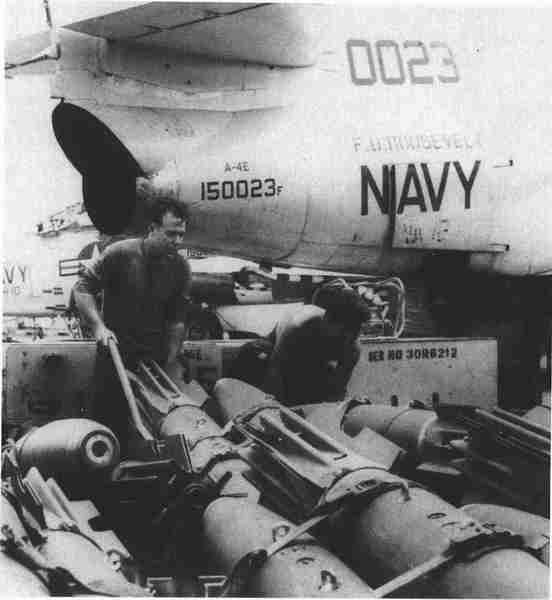 在越南战争期间,舰载飞机投掷了大量的炸弹,但携带了“铁炸弹”的舰载机的效率是非常有限的。图片中的水手和“富兰克林·D.罗斯福”号上的VA-72中队一起正在为对北越的另一次进攻准备折翅式炸弹。(J.D.高斯,《美国海军》)