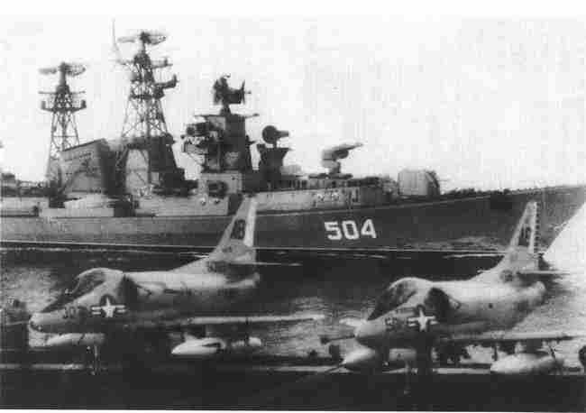 从20世纪70年代开始,苏联战舰频繁出现于美国航母的活动区域,既为了收集情报,同时又为了进行训练,以应对发生冲突时的潜在攻击。图示为1971年1艘苏联卡辛级导弹驱逐舰在地中海上接近美国的“富兰克林·罗斯福”号航母。(《美国海军》)