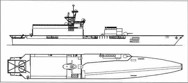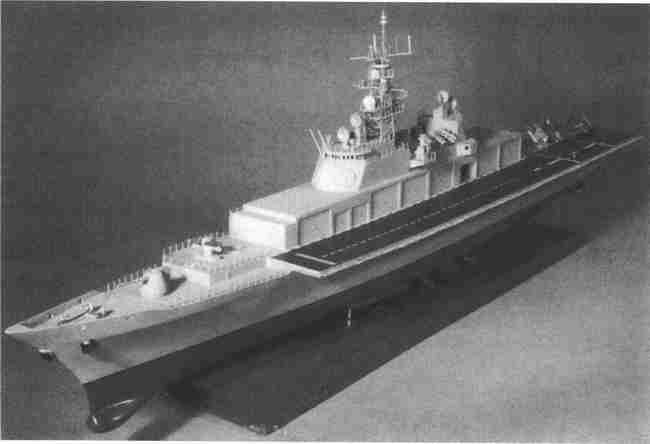 一艘垂直短距起落飞机战舰成形了。它是一艘具有防空能力的驱逐舰(已被设计成直升机驱逐舰)。位于密西西比州巴斯卡古拉的利顿/英格尔斯(Litton/Ingalls)造船厂在20世纪70年代中期赞助了一系列由驱逐舰出动垂直短距起落飞机的项目,当时,船厂正在建造30艘“斯普鲁恩斯”(Spruance)级反潜驱逐舰。