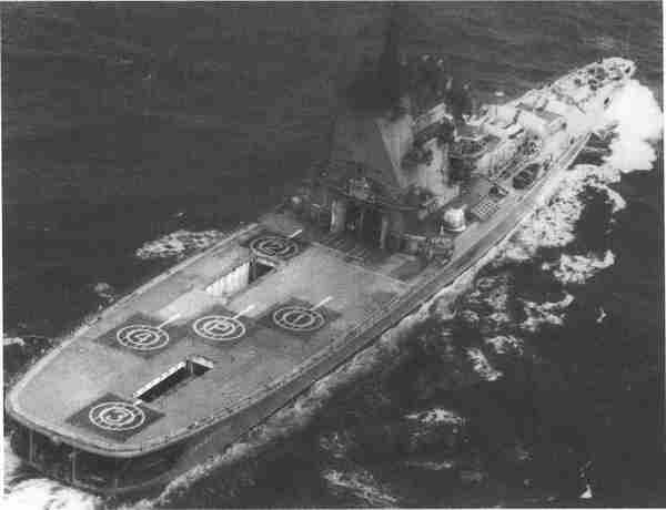 “列宁格勒”号直升机航母-导弹巡洋舰的姊妹舰是“莫斯科”号。图中航母为Ka-25直升机所提供的两个飞机库位于其上层结构的后方。两架飞行甲板升降机均降低到飞机库甲板上。位于飞行甲板上的直升机通过其网状设备探测到了减速后摇晃的直升机。飞行甲板的后端装备有拖曳线列阵声呐。(《美国海军》)
