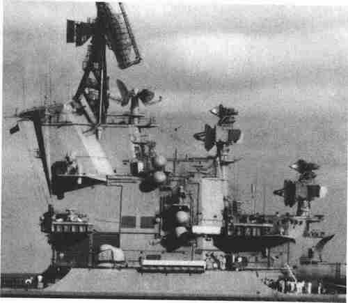 “莫斯科”号的岛状结构上布满了电子天线;从左边开始是“顶帆”(Top Sail)三维防空雷达;“头网-C”(Head Net-C)三维防空雷达;两个“前灯”(Head Light)火控雷达/指挥仪。最后一种设备可以支持防空和反潜武器。4个圆顶是“边球”(Side Globe)电子战争(EW)天线。以上均为美国-北约对苏联电子设备的命名。(《美国海军》)