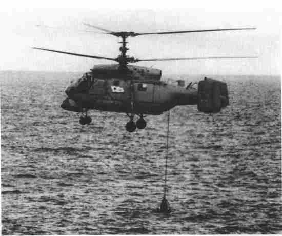 一架“卡莫夫”Ka-25(北约名称为“荷尔蒙A”)直升机正在空中盘旋,它的声呐系统正浸入水中。苏联设计家N.I.卡莫夫(N.I.Kamov)设计了大量带有倒转轮子的直升机,这样就缩小了直升机的尺寸,并且缓解了直升机对于尾部螺旋桨的需要。Ka-25的双涡轮轴发动机,可以为直升机提供136海里/小时(251.87千米/小时)的最大时速。飞机内部的武器舱可以容纳两枚小型的反潜自动寻的鱼雷或者深水炸弹。(国家航空航天博物馆)