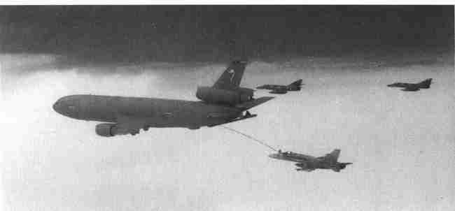 KA-6D“入侵”(Intruder)加油机的退役以及S-3B“海盗”(Viking)飞行中队的裁编都迫使舰载机不仅越来越依靠空军加油机,同时,还需借用F/A-18“大黄蜂”(Hornet)协同补给燃料。图中,一架空军KC-10“补充者”(Extender)加油机在为“约翰·C.斯坦尼斯”号航母第147攻击中队的F/A-18C“大黄蜂”加油,身旁两架“夏尔·戴高乐”(Charles de Gaulle)号航母携载的法国“超军旗”(Super Etendard)战斗机正等待返航。(《美国海军》)
