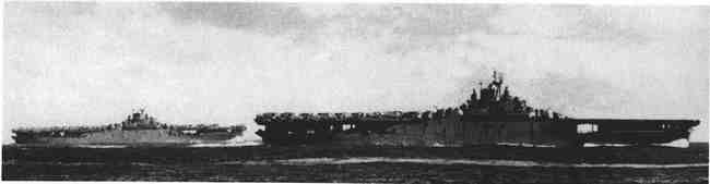 除了这些航空母舰,日军还有2只“飞行甲板”——身兼两种战舰类型的“日向”号(Hyuga)和“伊势”号(Ise)。这两艘战舰在中途岛战役后被改装为母舰-战列舰,船尾的2门14英寸(355.6毫米舰炮塔都被移除(船上保留8门14英寸(355.6毫米)炮塔),后甲板装备飞机库,并安装了飞行甲板。“日向”号和“伊势”号战列舰-母舰最初打算运载22架D4Y2“彗星”俯冲轰炸机,但是后来将飞机改为11架D4Y2和11架E16A“保罗”(Paul)水上轰炸机,飞机由634航空队驾驶,天谷孝久(Amagi Takahisa)上校负责指挥。