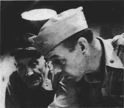 1945年早期,海军中将约翰·麦凯恩(左)与他的空中行动指挥官约翰·萨基(John H.Thach)中校在38特遣舰队的旗舰美国军舰“汉考克”号上(Hancock)。马克·米歇尔和麦凯恩先后任快速母舰部队指挥官,是母舰战斗历史上的领军人物。(《美国海军》)