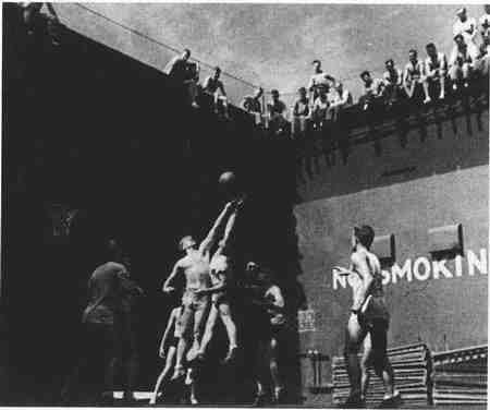 太平洋战争时期,未来的两位美国总统在小型航空母舰上服役:乔治·布什(George H.W.Bush)是战争中最年轻的海军飞行员,在“圣哈辛托”号上驾驶TBM攻击机,此时,他正坐在一架“复仇者”攻击机的后座上,他将飞机命名为“芭芭拉”号,纪念他未来的妻子芭芭拉·皮尔斯(Barbara Pierce)。小杰拉尔德·福特(Gerald R.Ford,Jr.)正在“蒙特雷”号上,船前面的升降井处正在进行一场篮球比赛,图中(下)福特正在跃起抢球。(《美国海军》)