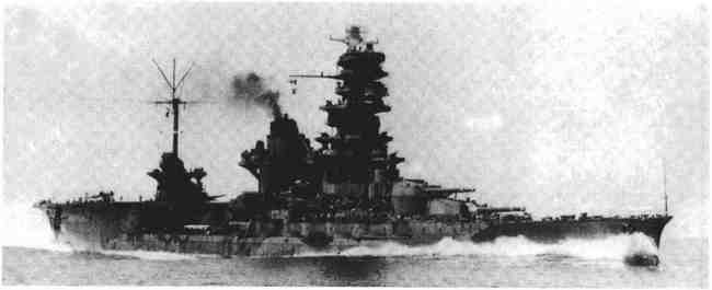 战列舰-母舰 [ 注:航空战舰 ] “伊势”号在海上行驶。与其姐妹舰“日向”号一样,它可以在飞机库和飞行甲板(由升降机连接)携带22架攻击机。然而,当这种身兼两种战舰类型构造的舰船参加战斗时,没有飞机可以在舰上服役。在船尾同样装备了飞行甲板的重型巡洋舰上没有飞机。注意该图中可以看到“伊势”号塔状上层建筑的雷达天线以及飞行甲板上只有唯一的一架飞机。(《美国海军》)