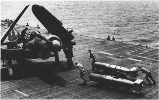 “大黄蜂”号母舰上的水手们将Mk13型鱼雷运向1架VB-2中队的SB2C“地狱俯冲者”战斗机。SB2C战斗机在携带鱼雷时需要卸下炸弹舱门,并安装特殊的固定装置,然而,在实际操作中,飞机从来没有携带过鱼雷。航空历史学家巴雷特·梯尔曼解释说,这可能是美军在1944年中期战斗间歇期间进行的一项装载训练,目的是保持SB2C战斗机拥有装载鱼雷的可能性。(《美国海军》)