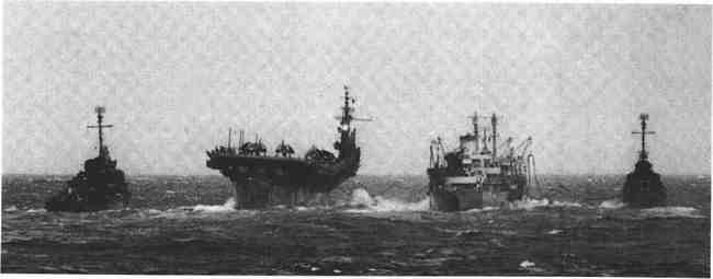 在西太平洋的某处,一艘油船同时在给位于它左右两弦的轻型航母“兰利”号(Langley)和一艘驱逐舰加油。另一艘驱逐舰(左)在一旁等待。在航行的过程中补充子弹、炸弹、油和大量其他必需品使得快速航母舰队能够在更远更大范围内作战。配有补给部队的护航航母为反潜战提供防卫和后备战斗机。(《美国海军》)