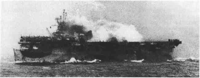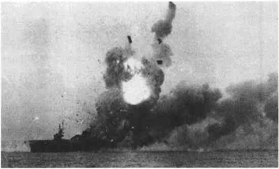 当一架未被发现的日军战斗机从云彩后面飞出准备俯冲向美军航母时,“桑提”号已经派出了8架“野猫”(Wildcat)战斗机和5架“复仇者”战斗机。这次攻击如此突然以至于没有武器可以进行防御。潜人的“零式”战斗机猛攻“桑提”号,7时45分,这架飞机猛地撞向这艘航母的前甲板冲进了他的飞机库。爆炸在甲板上炸出了一个15×30英尺(4.57×9。14米)的大洞并燃起了大火。火势在不到10分钟内就得到了控制。16名美军船员由于爆炸和大火而丧生,27人受伤。神风突击队的自杀式飞机飞行员已经完成了他的使命,而且完成得非常出色。但是那些制造并操纵“桑提”号航母的美军人员同样干得非常出色。