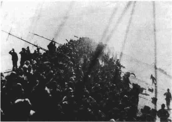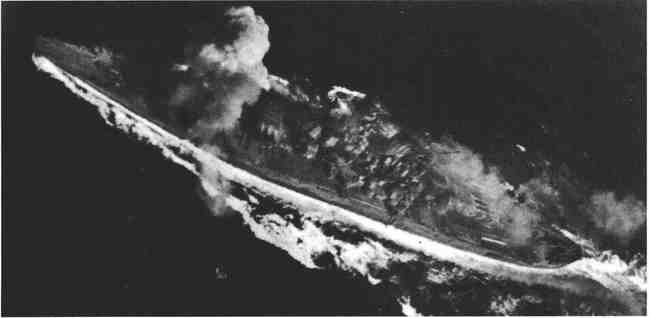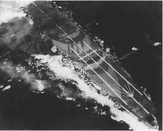 “瑞鹤”号航母在莱特湾海战的恩加诺角海战中遭受了美国空中力量的打击。它是6艘袭击美国珍珠港的航母中最后的幸存者。飞行甲板上的图案会让人误认为它是一艘战列舰,但是现在已经毁坏了。请注意它右舷的烟囱和它左舷的雷达天线已经横了过来。(《美国海军》)
