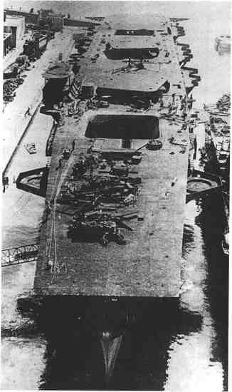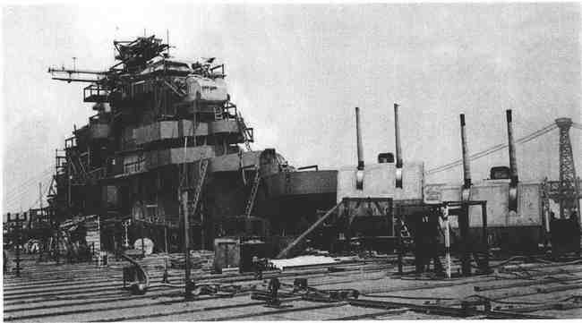 如图所示为1945年还在纽约的海军造船厂建造当中的“奥里斯卡尼”号(Oriskany)(CV34),它是“埃塞克斯”级的航母。它的木制飞行甲板还没有安装好。战争结束后一年,也就是1946年8月29日,“奥里斯卡尼”号的建造工作才停止,当时85%的工作已经完成了。它将会被广泛地再生产和出现在美国的造船厂,因为它是世界上第一艘可以承载喷气式飞机的航空母舰。(《美国海军》)