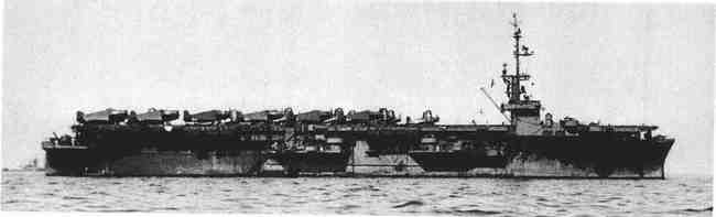 如图所示为1945年7月的“吉尔伯特群岛”号航母,它是“科芒斯曼特湾”号(Commencement Bay)级护航航母之一,战争结束以前其中几艘参加了战斗。这些航母是类似于极其成功的“桑加蒙”级改装油轮的复制品。它们在大小和舰载量上与轻航母相似,但是没有轻航母速度那么快。请注意航母舷边的炮管阴影;它的甲板上装载了TBM“复仇者”和F4U“海盗”战机。(《美国海军》)