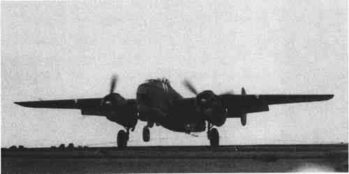 在战争期间,海军为多种多样的战机可能的舰载使用进行评估。“香格里拉”号航母在执行PBJ-1H和P-51D“野马”战机的试飞(如图所示,带有1条明显的电线的是PBJ-1H),PBJ-1H是B-25H“米切尔”战机的海军陆战版本。2架战机都停滞性地着陆到航母上而且都是被用弹射器发射出去的。PBJ-1H战机配有14挺0.5英寸(12.7毫米)口径机枪和1门75毫米加农炮;它可以承载3200磅(1440千克)的炸弹和1枚鱼雷。这是1942年4月杜利特尔-哈尔西突击中从“大黄蜂”号航母(CV8)上起飞的B-25B的变种。(《美国海军》)