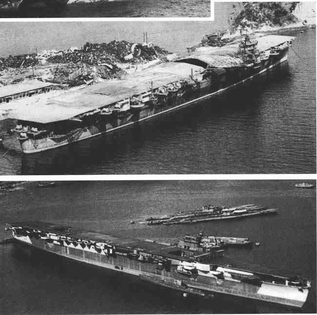 1945年仍然漂浮在海面上的日军最古老的航母是1.05万吨的“凤翔”号,它是1922年建造完成的。1942年6月的中途岛-阿留申群岛战役过后,“凤翔”号就被当作训练航母和靶船来执行任务,而且仅仅活动在内海。1944年,马里亚纳海战之后,日军加长了它的飞行甲板。在1945年3月19日美军58特遣舰队的空袭中,停泊在吴港的“凤翔”号遭到了1枚炸弹的袭击,受了轻伤。它在7月24日38特遣舰队的战机袭击中也受了轻伤。
