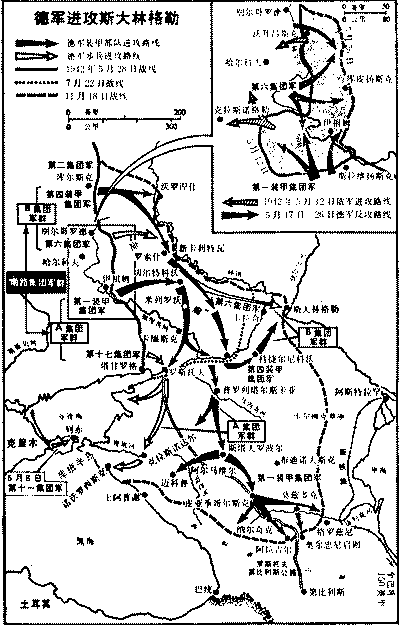 只在一侧深入推进,而不对敌军的中心同时施加压力,这种打算同德国将领自幼就灌输的战略原则是抵触的。在他们看来更加糟糕,因为翼侧进军就要在俄军主力与黑海之间腹背受敌。他们一想到,在内陆的翼侧大半要依靠罗马尼亚、匈牙利和意大利部队的保护,就更加担心。希特勒对他们焦急的询问给以明确的答复,说是德国只有取得高加索石油供应,才能在战争中自力更生。至于冒险依赖盟军保护翼侧的问题,他说,这些部队都要用来防守顿河防线,还有斯大林格勒和高加索之间的伏尔加河防线——在这些地方,河流本身就是天然屏障。攻克斯大林格勒以及坚守这一要地的任务,全部交给德军执行。