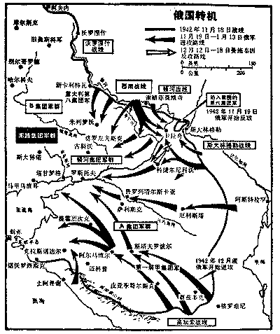 在斯大林格勒西北面,俄军先头部队沿着顿河两岸直冲到卡拉奇和西通顿涅茨河流域的铁路。在斯大林格勒东南面,左钳的一些尖头向西直冲到南达提霍烈次克和黑海的铁路。在切断这一线之后,他们进逼卡拉奇,到23日已合围成功。在其后几天,他们把第六集团军和第四装甲集团军的一个军包围起来,包围圈就收得更紧了。在快速运动的那几天里,俄军一面保住防御战术优势,一面在战略上也转败为胜——通常,采用间接途径,是往往能够取得这种双重胜利的。因为当时德军不得不继续进攻——不是为了突进,而是为了突围。他们的退兵正如早先的进军一样白费力气。